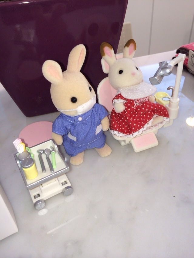 ウサギさんは可愛い顔ながら、治療器具(デンタルミラー、エアタービン、うがい用のコップ、バキューム、アルコール綿用の容器)やマスク、患者さん用エプロンまで!!このまま治療ができそうなセットです