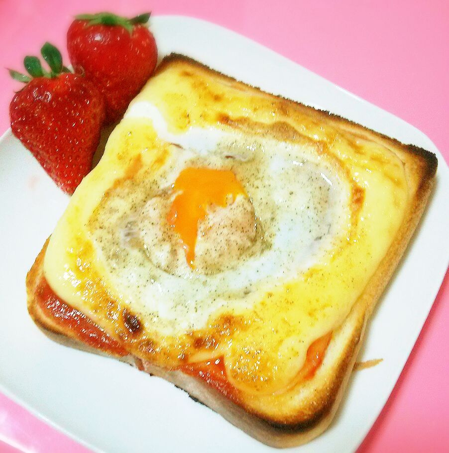 卵が半熟の半熟ぐらいのドゥルルル感なのでお皿の上でナイフとフォークで食べました( ^ω^ )これ卵割る前に下にベーコンしいて卵の上には粉チーズ振ったらもっとおいしくなりますね(´┓`*)