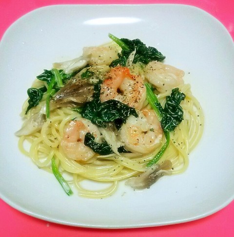 えびとほうれん草と舞茸フライパンにポイポイして炒めて生クリームドバー!して後は味付けなんですけど